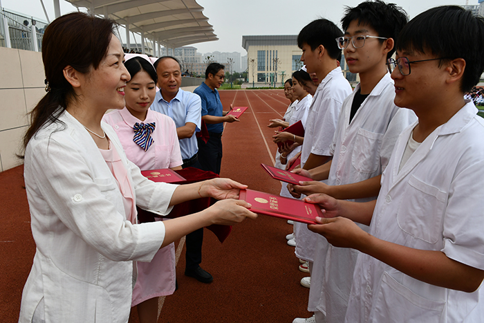 學(xué)校黨委書記孫娟發(fā)表重要講話。與全校師生共同回顧了中華人民共和國成立75周年的偉大歷史進程,激勵師生們以實際行動向祖國獻禮,并對同學(xué)們提出了三點殷切期望:一是堅毅篤行、勤學(xué)實干,用真才實學(xué)救治患者疾苦。讓勤奮學(xué)習(xí)成為青春遠航的動力,鼓勵同學(xué)們在學(xué)醫(yī)之路上勇往直前、充實自我,將個人成長與國家命運緊密相連,使學(xué)生深刻認識到努力學(xué)習(xí)是為國家建設(shè)儲備力量;二是堅守初心,錘煉品德,用高尚醫(yī)德書寫醫(yī)者人生,牢記使命,為人民群眾提供優(yōu)質(zhì)醫(yī)療服務(wù),實現(xiàn)專業(yè)教育與思政教育深度融合,培養(yǎng)學(xué)生職業(yè)道德與社會責任感;三是攻堅克難,勇于創(chuàng)新,用青春之我助力中國之夢。為實現(xiàn)中華民族偉大復(fù)興夢貢獻力量,強調(diào)青年學(xué)生在國家發(fā)展中的重要責任,激發(fā)學(xué)生愛國情懷與擔當精神。